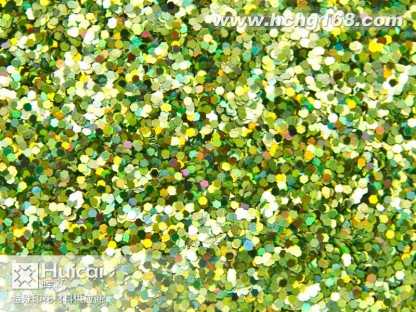 金葱粉:又名闪光片。包括铝质金葱粉,聚酯金葱粉幻彩粉,镭射金葱粉等。有铝质,PETPVC材质。大小规格(size)由1/25601mm)至1/830mm)。形状有六角形,四角形,长条针形和不规则形状,并有多种颜色可供选择。各种材质金葱粉可不同程度承受高温(由80*C180*C300*C不等) 。