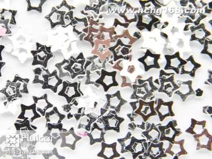 金葱粉:又名闪光片。包括铝质金葱粉,聚酯金葱粉,幻彩粉,镭射金葱粉等。有铝质,PET,PVC材质。大小规格(size)由1/256(0、1mm)至1/8(3、0mm)。形状有六角形,四角形,长条针形和不规则形状,并有多种颜色可供选择。各种材质金葱粉可不同程度承受高温(由80*C,180*C,300*C不等) 。
