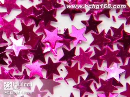 金葱粉:又名闪光片。包括铝质金葱粉,聚酯金葱粉,幻彩粉,镭射金葱粉等。有铝质,PET,PVC材质。大小规格(size)由1/256(0、1mm)至1/8(3、0mm)。形状有六角形,四角形,长条针形和不规则形状,并有多种颜色可供选择。各种材质金葱粉可不同程度承受高温(由80*C,180*C,300*C不等) 。