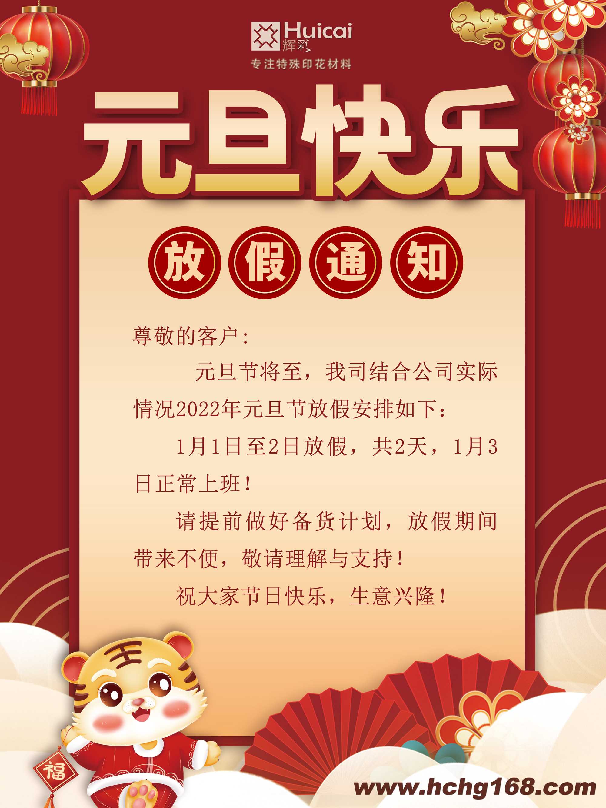 根据《国务院办公厅关于2022年部分节假日安排的通知》,并结合我司实际情况,辉彩印花材料厂家现将2022年元旦放假日期安排通知如下: